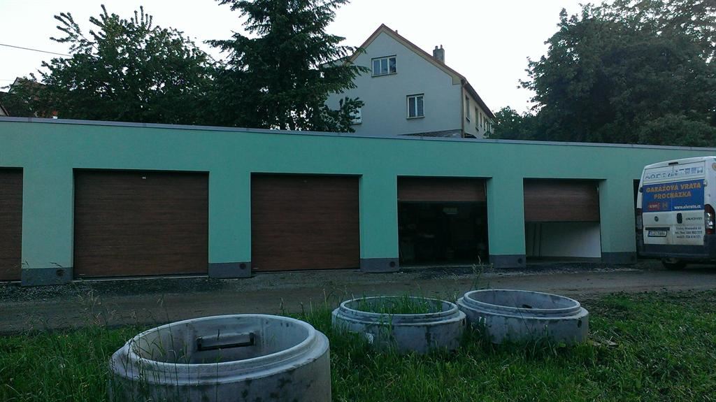 Sekční vrata Krispol, folie dřeva zlatý dub, pruh, woodgrain. Panely vrat tvoří ocelový plášť vyplněný tuhou polyuretanovou pěnou o síle 40mm. Všechna vrata se ovládají elektrickými pohony Nice Spin11 s dálkovým ovládáním Nice Flo2R. Ve vratech jsou instalovány nouzové zámky pro případ výpadku el.energie. Vrata jsou namontovány ve Štěměchách na Třebíčsku.