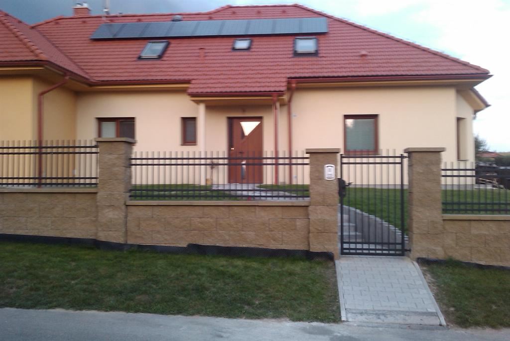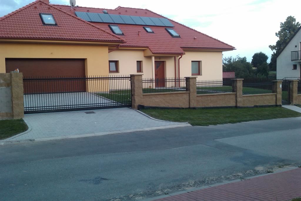 Kompletní dodávka vjezdové samonosné brány, vchodové branky a oplocení. Vše z ocelového profilu ošetřeného žárovým zinkem a následnou úpravou vysoce odolnou kovářskou černou barvou. Vjezdová brána se ovládá elektrickým pohonem Nice s dálkovým ovládáním, které je sladěno s garážovými sekčními vraty Krispol ve folii dřeva. Tuto zakázku včetně sekčních garážových vrat jsme realizovali u rodinného domu v Nové Vsi na Třebíčsku.