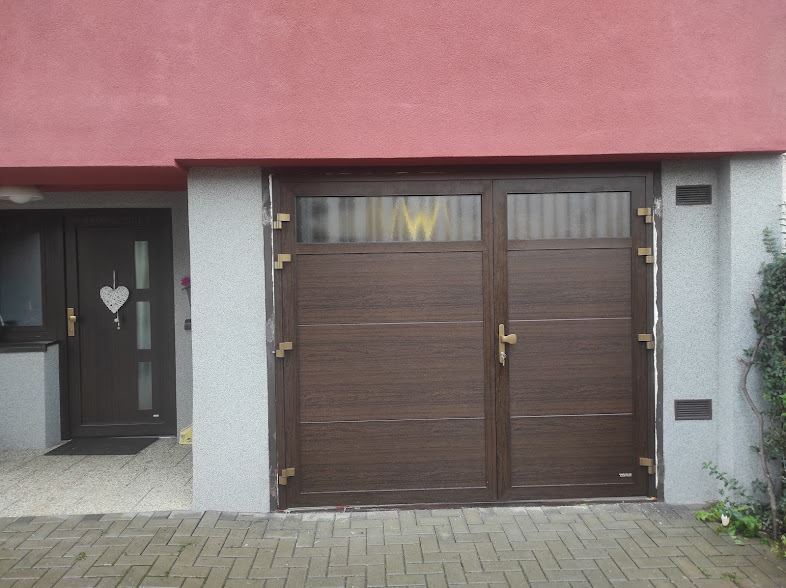 Křídlová vrata ve folii tmavý dub eiche dunkel, atypické rozdělení křídel, v horní části prosklení typ činčila. Tato křídlová vrata jsme montovali v Třebíči.