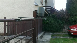 Elektrické pohony Somfy Axovia MultiPro se speciálními rameny pro otvírání ven. Komfortní sada obsahuje maják, ochranné fotobuňky, záložní zdroj a dálkové vysílače. Tyto pohony jsme instalovali ke křídlové vjezdové bráně v Třebíči.