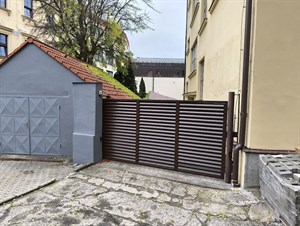 Vjezdová brána jednokřídlá do vjezdu 3800 mm, výplň ALU lamela v RAL 8014. Brána se ovládá elektrickým pohonem s dálkovým ovládáním. Tuto vjezdovou bránu jsme vyrobili a namontovali v Třebíči.