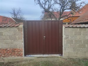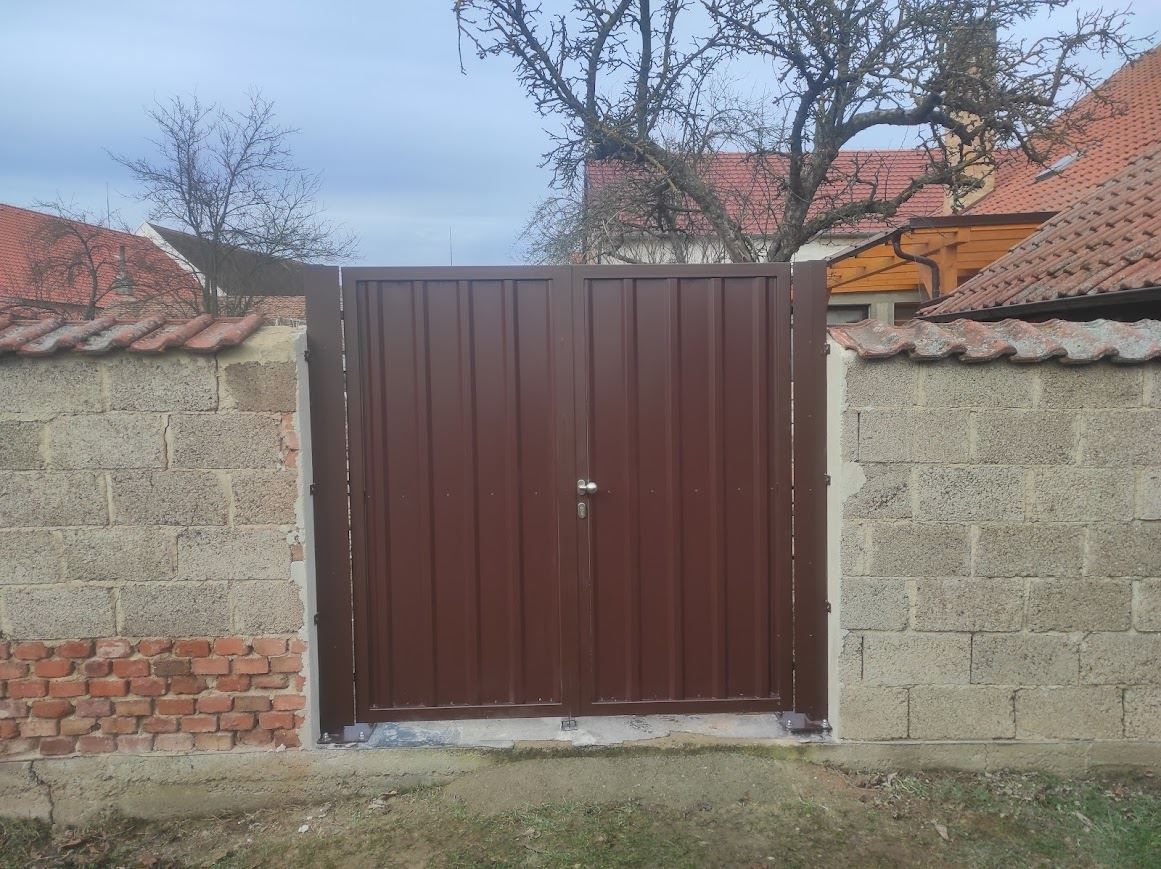 Křídlová vrata do vjezdu, ocelová zinkovaná konstrukce se sloupky, výplň plech hnědý trapézový plech. Tato vrata jsme vyrobili a namontovali v Lázu u Moravských Budějovic.