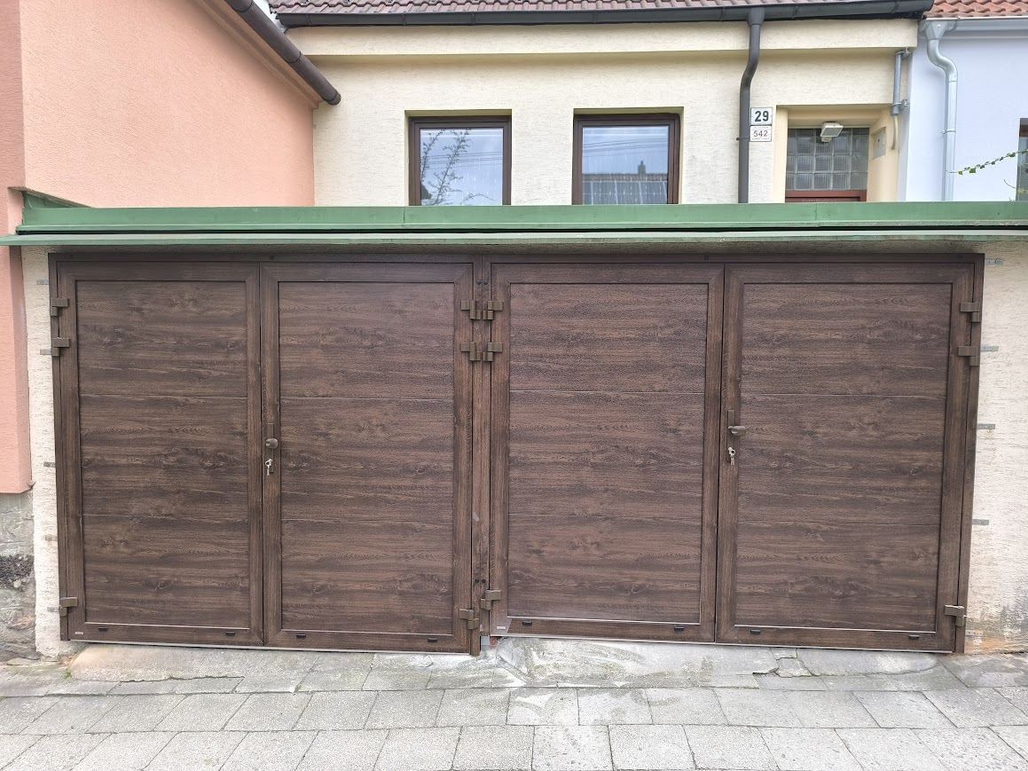 Křídlová vrata 2 ks rozm. 2300x1880 mm, dekor dřeva ořech, kování a panty do RAL 8014. Alu teplý profil, systém tříkomorových profilů. Tato křídlová vrata jsme montovali v Třebíči.