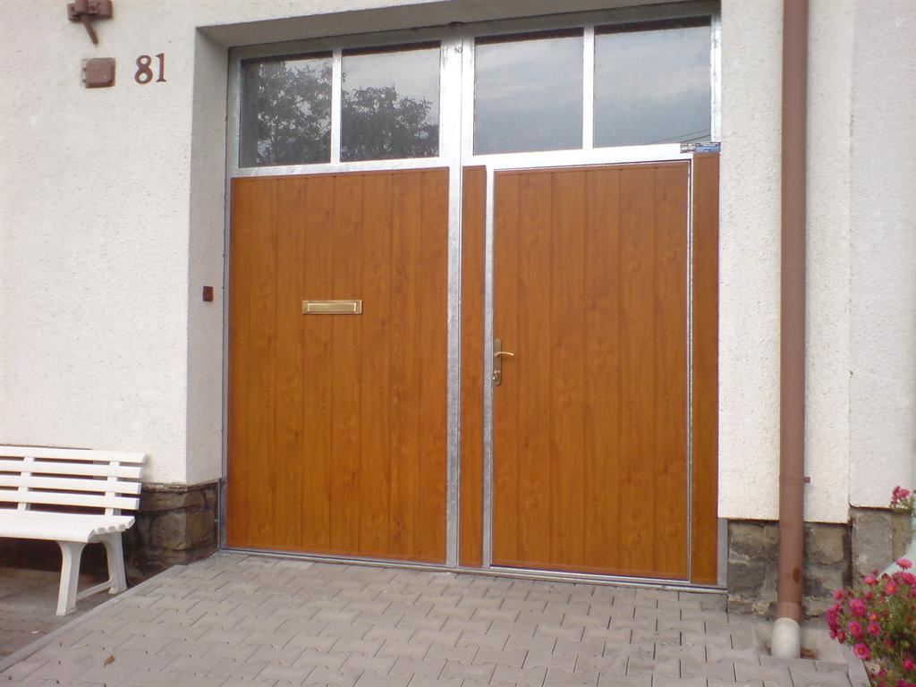 Křídlová vrata jsou s výplní v dekoru dřeva zlatý dub. Otvíravá dovnitř, exteriérová palubka zlatý dub s vloženou poštovní schránkou. Na dveřmi je instalován světlík s čirým sklem. Instalace v Kyjově.
