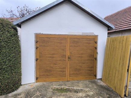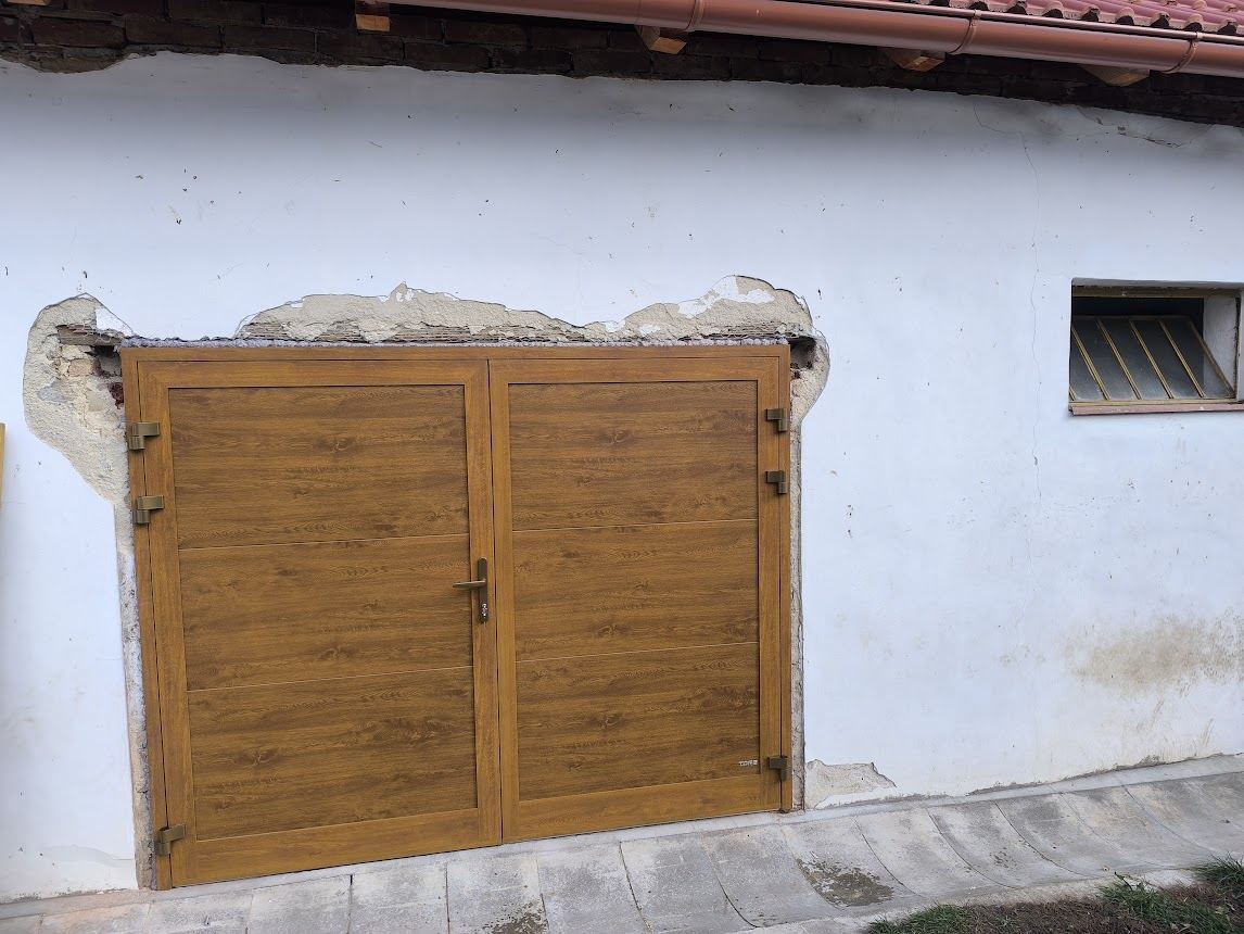 Křídlová vrata v dekoru dřeva zlatý dub, zateplené panely PUR. Tato vrata jsme montovali v Panenské u Jemnice.