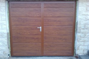 Tato křídlová garážová vrata jsou vyplněna ocelovými panely zateplenými PU pěnou. Povrchová úprava zlatý dub hladký. Ocelový zinkovaný rám je opatřen nástřikem do barvy RAL 8003.