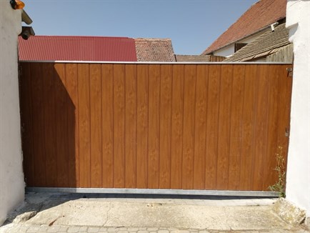 Samonosná vjezdová posuvná brána průjezd 4000mm, výška 2000mm. Brána je vyrobena z ocelových pozinkovaných profilů, venkovní výplň fasádní plastová palubka zlatý dub, vnitřní záklop zn plech. Vjezdová brána se ovládá elektrickým pohonem Nice s dálkovým ovládáním. Tuto bránu jsme vyrobili a namontovali ve Výčapech u Třebíče.