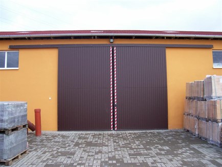 Tato posuvná vrata tvoří dvě ocelová křídla, která se odsunují po kolejnici do stran. Na výplň je použita ..... Tato vrata jsme instalovali v Třebíči. Na vedlejší budovu jsme vyrobili a namontovali prosklení v rámu.