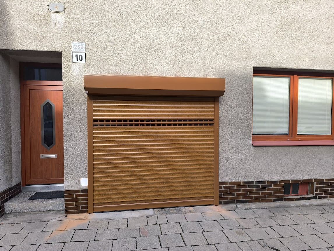 Rolovací vrata, hliníková lamela PA77, s větrací lamelou dole, v horní části 2 prosvětlovací lamely. Vrata se ovládají elektrickým pohonem s dálkovým ovládáním. Tato vrata jsme montovali v Třebíči.