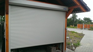 Rolovací vrata s el.pohonem. Lamela i box v šedé barvě. Tato rolovací vrata jsme instalovali v Novém Telečkově.