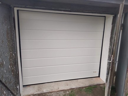Sekční vrata bílá středová drážka hladká, rozm. 2420x2000 mm, panel PUR 40mm. Vrata se ovládají elektrickým pohonem s dálkovým ovládáním. Tato dvoje sekční vrata jsme montovali v Dolních Lažanech na Třebíčsku.