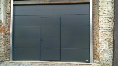 Sekční vrata v barvě antracit RAL 7016, rozměr 3460x2600mm. Sekční vrata jsou vyrobena ze zatepletných sekcí tl. 40mm. Integrované dveře s nízkým prahem, eloxovaný rám dveří a štítek kliky jsou také v RAL 7016. Kulaté sloupky po stranách jsme obložili pozinkovaným U plechem. Tato sekční vrata se ovládají elektrickým pohonem Beninca JIM.3 s dálkovým ovládáním. Tato vrata jsme instalovali v Petrovicích na Třebíčsku.
