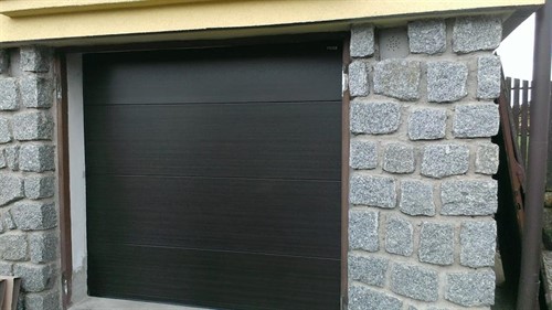 Sekční vrata ve folii tmavý bahenní dub Mooreiche, rozm. 2360x2170mm, s tažnými pružinami, extra nízké nadpraží. Zateplené sekce se 40mm PUR. Vrata se ovládají elektrickým pohonem BFT s dálkovým ovládáním. Tato vrata jsme instalovali ve Stříteži u Třebíče.