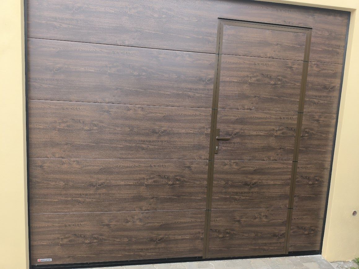 Sekční vrata s integrovanými dveřmi rozm. 2950x2550 mm. Dekor dřeva ořech, panel PUR 40mm. Tato sekční vrata jsme montovali v Čechtíně u Třebíče.