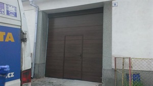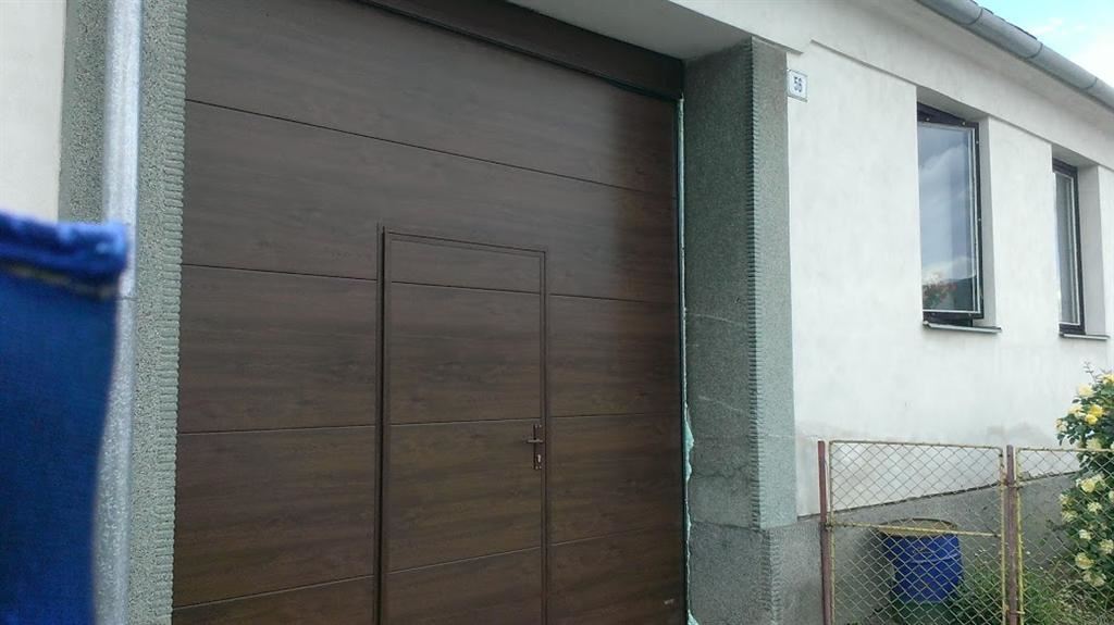 Sekční vrata rozm. 2960x3000mm v dekoru dřeva ořech. Zateplené panely PUR pěnou 40mm. Vrata jsou uchyceny v zn konstrukci, v horní části zakrývací blenda ve folii ořech. Ve vratech jsou umístěny integrované dveře s nízkým prahem, hliníkové profily pokašírované ve folii ořech. Tuto zakázku jsme montovali ve Výčapech u Třebíče.