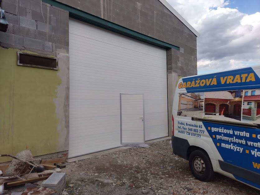 Sekční průmyslová vrata s vloženými personálními dveřmi, lamela MW stucco bílá RAL 9010. Zvýšené průmyslové kování. Vrata se ovládají řetězovým převodem "kočka". Tato sekční vrata jsme montovali ve Slavicích u Třebíče.