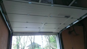 Sekční garážová vrata o rozměru 2870x2980mm, zateplení PUR 40mm, v dekoru dřeva ořech - středová drážka hladká. Horní část vrat je prosklenná, sklo satin. V sekčních vratech jsou vloženy integrované dveře s nízkým prahem pro snazší průchod osob. Všechny Alu profily jsou pokašírované do folie dřeva ořech. Vrata se ovládají elektrickým pohonem Beninca s dálkovým ovládáním. Zakázku jsme montovali ve Stříteži u Třebíče.