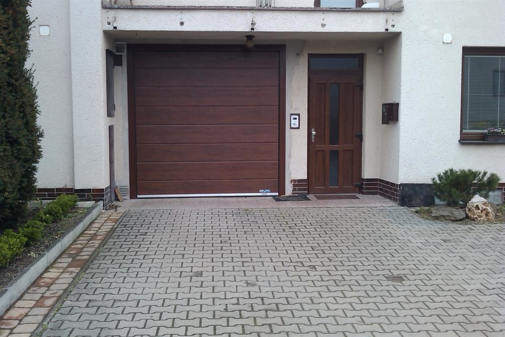 Sekční garážová vrata Trido-Evo v dekoru dřeva ořech se otevírají elektrickým pohonem Sommer. Součástí el.pohonu je dálkové ovládání. Sekce jsou v prolisu středová drážka. Tato vrata jsme instalovali v rodinném domě v Třebíči.