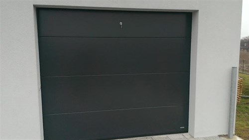 Sekční garážová vrata zateplená PUR 40mm, hladká sekce bez drážek v RAL 7016. Vrata se ovládají elektrickým pohonem Nice s dálkovým ovládáním. Protože není jiný vstup do garáže, v horní sekci je umístěn nouzový zámek pro případ výpadku el.energie. Tato sekční vrata jsme instalovali ve Studnici u Budišova.