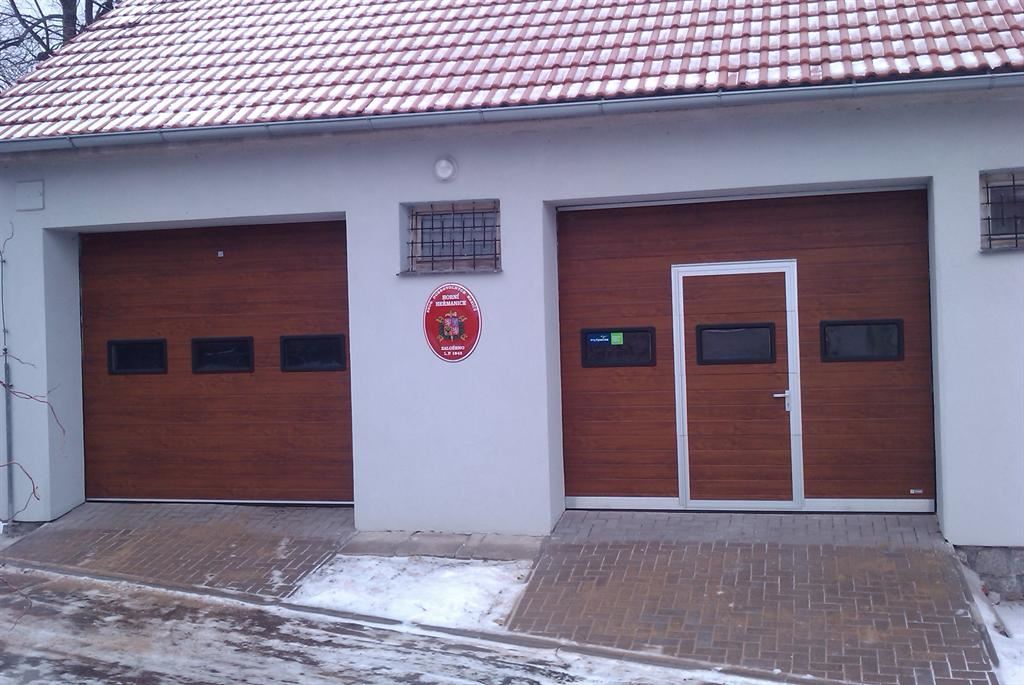 Sekční garážová vrata ze zateplených panelů vyplněných PUR pěnou 40mm, v dekoru dřeva zlatý dub, úzký pruh woodgrain. Oboje vrata jsou s prosklením, jedny mají personální dveře s nízkým prahem. Vrata se ovládají elektrickým pohonem Nice s dálkovým ovládáním. Tato sekční vrata jsme instalovali na OÚ Horní Heřmanice.