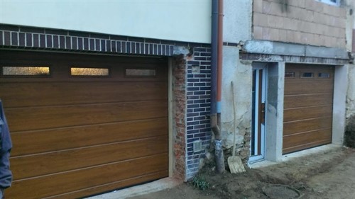Dvoje sekční vrata v dekoru dřeva zlatý dub, středová drážka hadká. Zateplený panel 40mm PUR. V horním panelu je umístěno 3x prosklení 600x170mm. Sekční vrata se ovládají elektrickým pohonem BFT s dálkovým ovládáním. Tato vrata jsme montovali v obci Lukov u Moravských Budějovic.