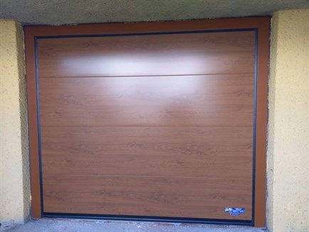 Sekční vrata Trido-EVO rozm. 2280x1940mm, zateplené PUR panely v dekoru dřeva zlatý dub hladký bez drážek. Vrata se ovládají elektrickým pohonem s dálkovým ovládáním. Tato sekční vrata jsme montovali v Třebíči.