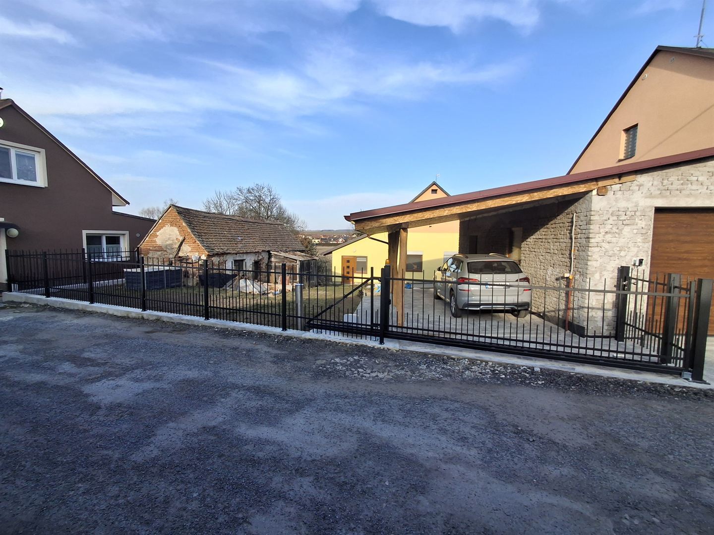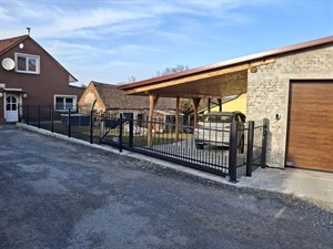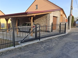 Vjezdová brána, branka a oplocení z ocelových profilů, žárově zinkované, komaxit černá barva. Brána se ovládá elektrickým pohonem s dálkovým ovládáním. Tuto bránu, branku a plot jsme vyrobili a namontovali v Jaroměřicích nad Rokytnou.