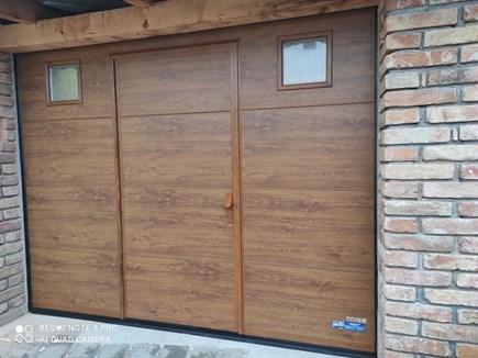 Sekční vrata s integrovanými dveřmi zlatý dub v nástřiku, rozměr 2650x2100mm. Tato sekční vrata se ovládají elekrickým pohonem s dálkovým ovládáním. Tato vrata jsme instalovali v Boleradicích.